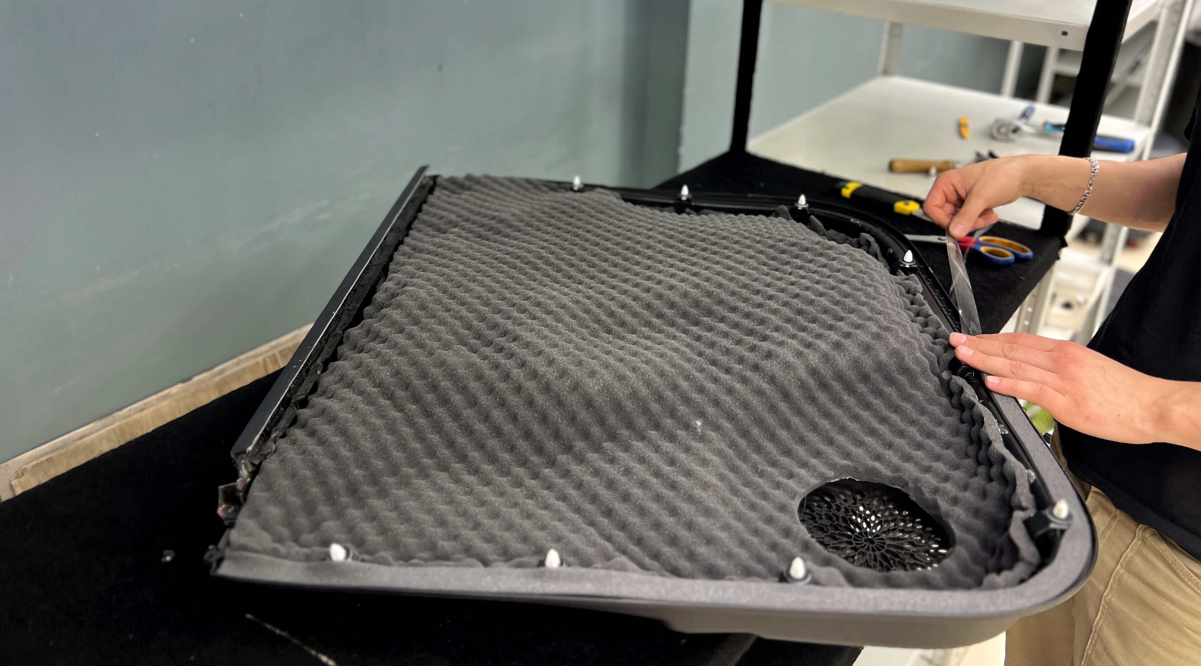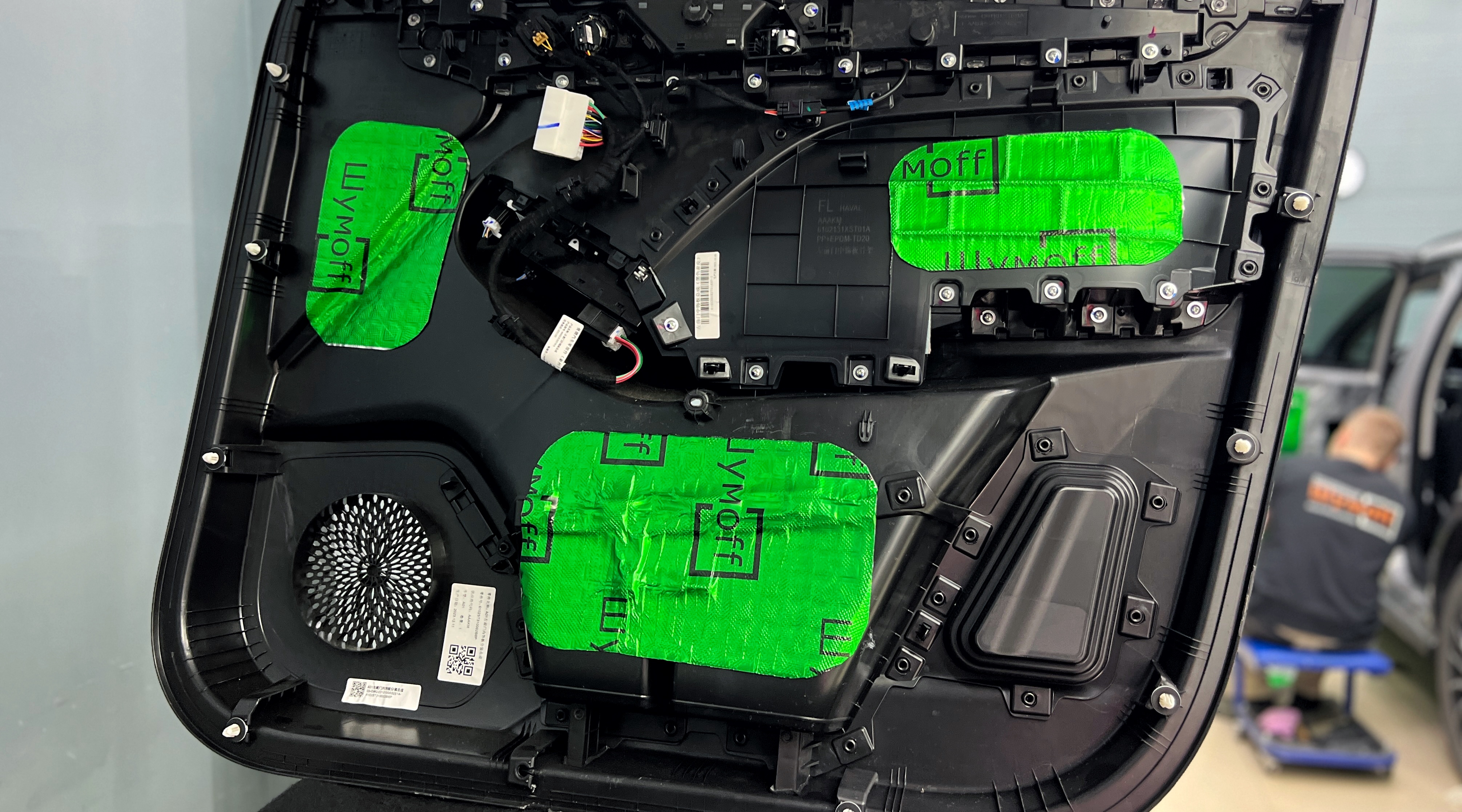 Оклейка технологических отверстий дверей Хавэйл Джолион Для второго слоя на технологические отверстия используем так же Шумофф М2. Этот слой помимо еще одного барьера для внешнего шума позволит раскрыть потенциал акустической системы, установленной в дверях.