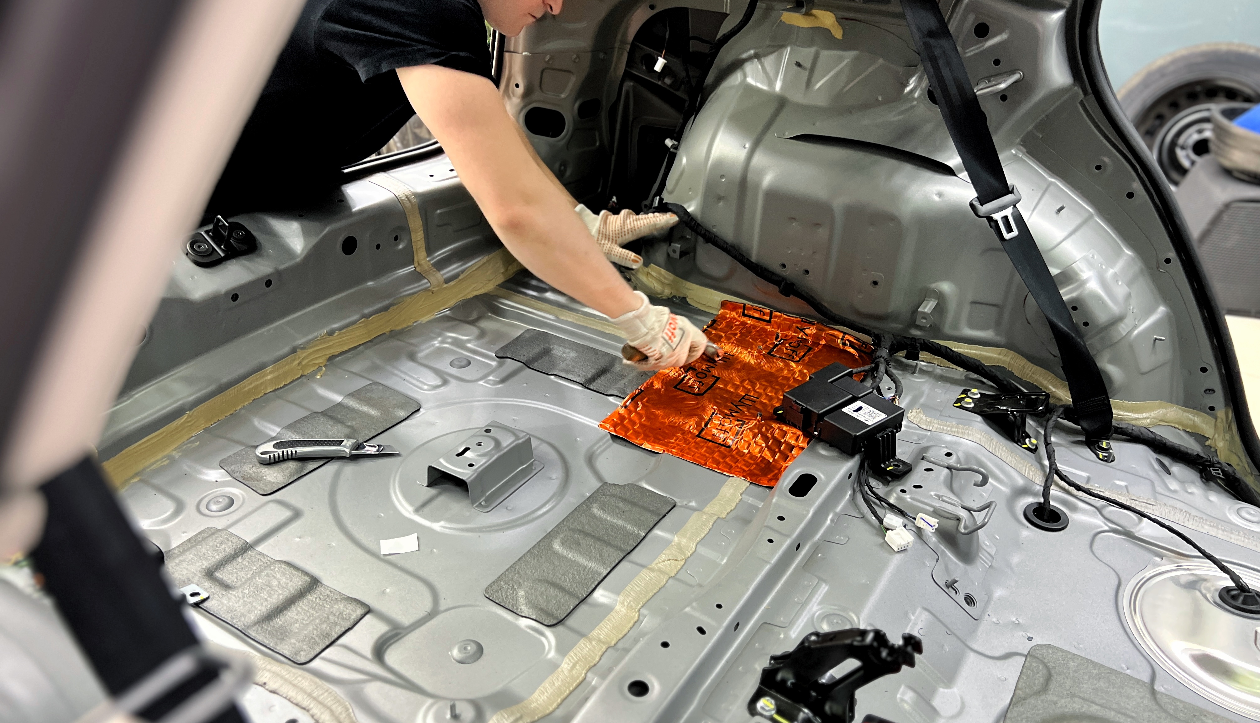 Обезжириваем поверхность и приступаем к монтажу второго слоя. Также для получения более эффективного результата используем компоновку из двух материалов На дно багажника клеим Шумофф Base 4. Этот слой позволит снизить нам шум от дороги.