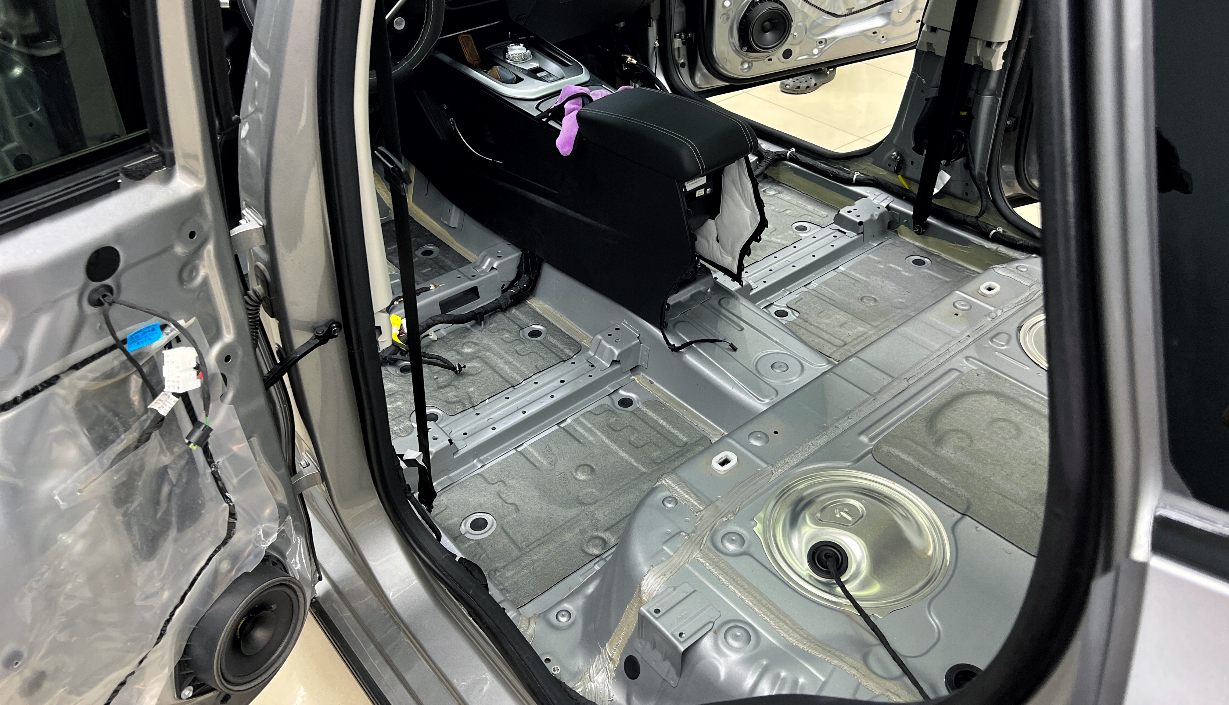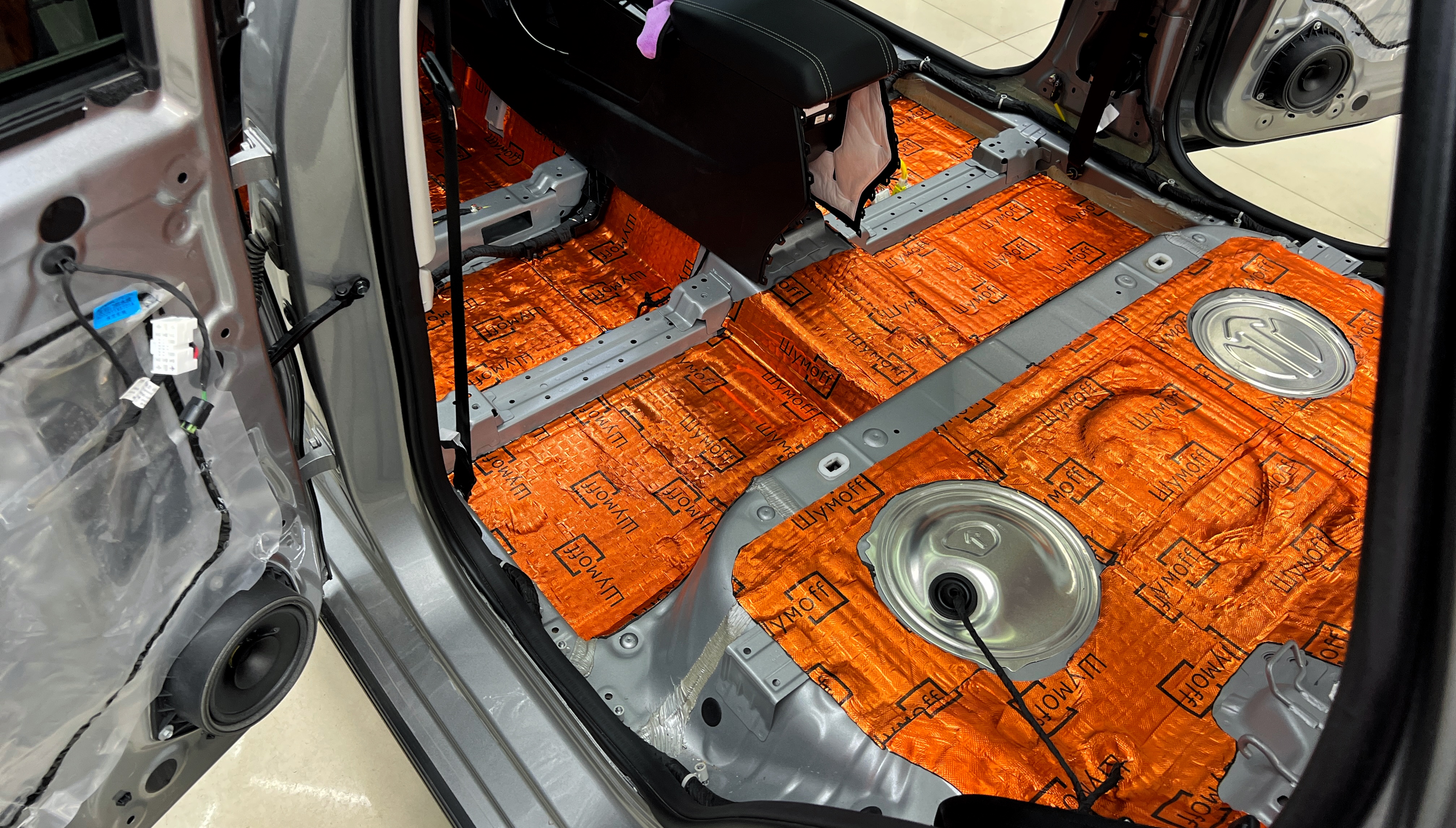 Шумоизоляция пола Хавейл Джолион Вторым слоем поверх M4 клеим шумопоглотитель с черным влагозащитным покрытием Шумофф Герметон 7Л.