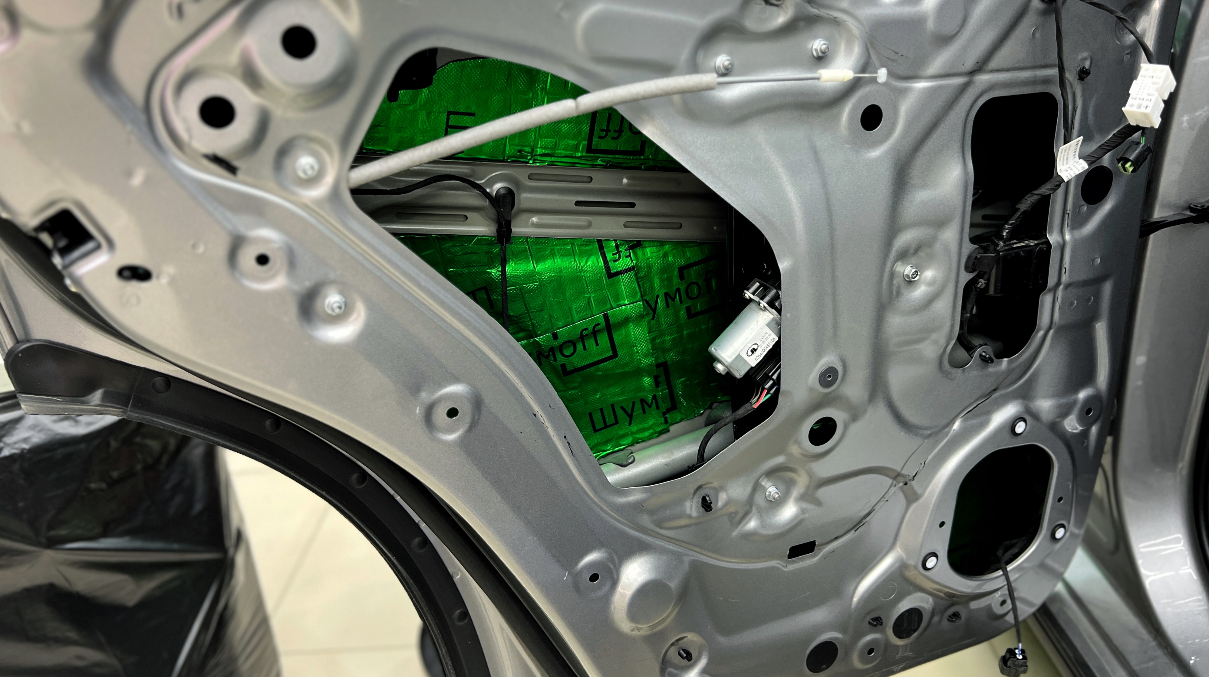 Виброизоляция дверей Хавэйл Джолион Первым слоем на внутреннюю часть двери клеим виброизоляцию Шумофф М2. Этот слой поможет нам улучшить звучание акустики, а также сделать закрывание дверей более приятным.