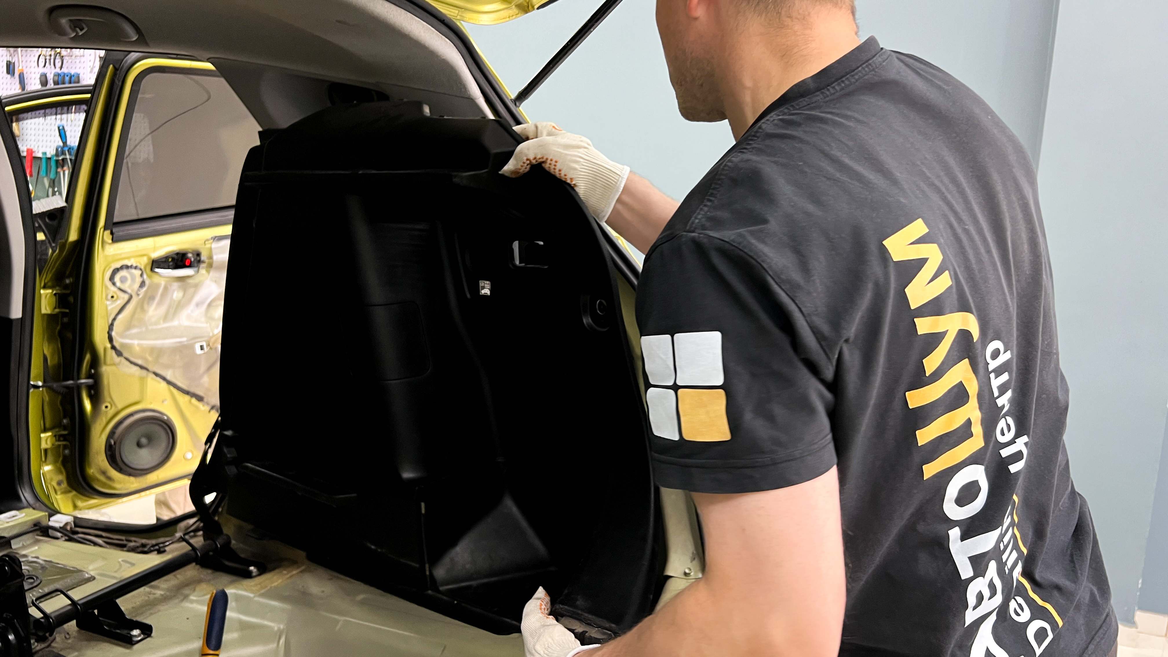 Для виброизоляции крыши багажника используем материал Шумофф L2, чтобы свести увеличение веса к минимуму. После чего переходим к обшивке.