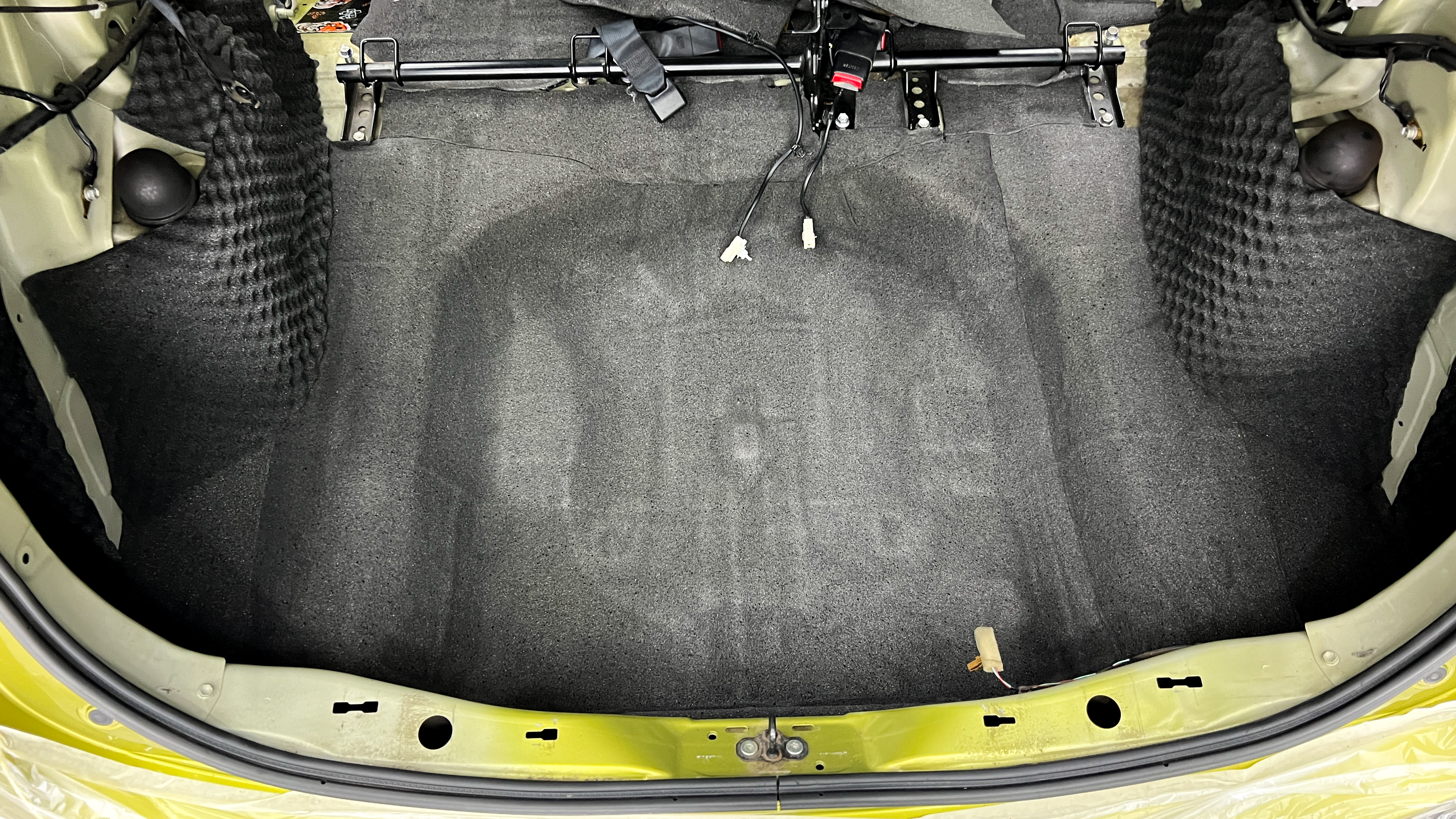 Обезжириваем поверхность и приступаем к монтажу второго слоя. Также для получения более эффективного результата используем компоновку из двух материалов На дно багажника клеим Шумофф Base 4. Этот слой позволит снизить нам шум от дороги.