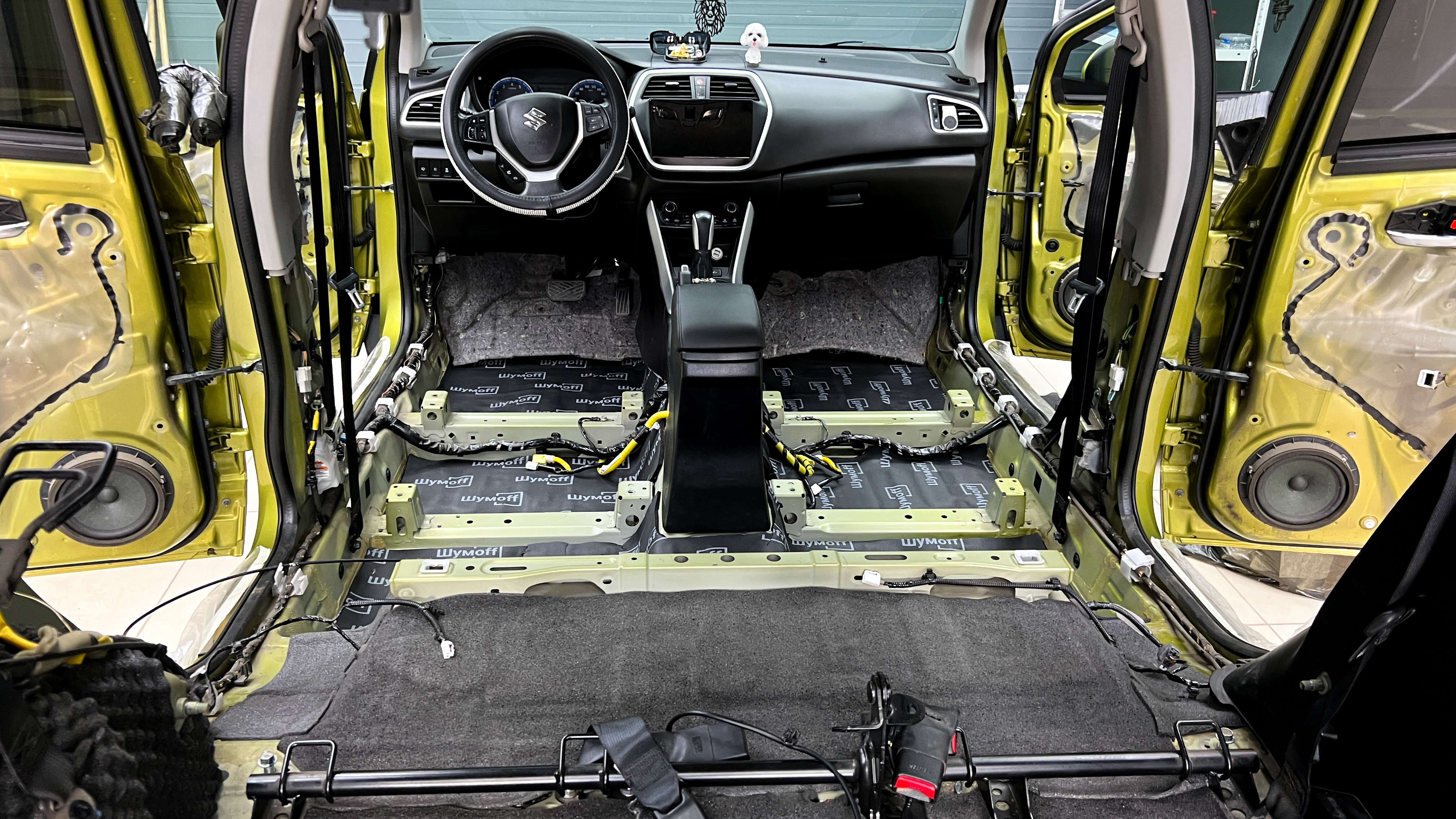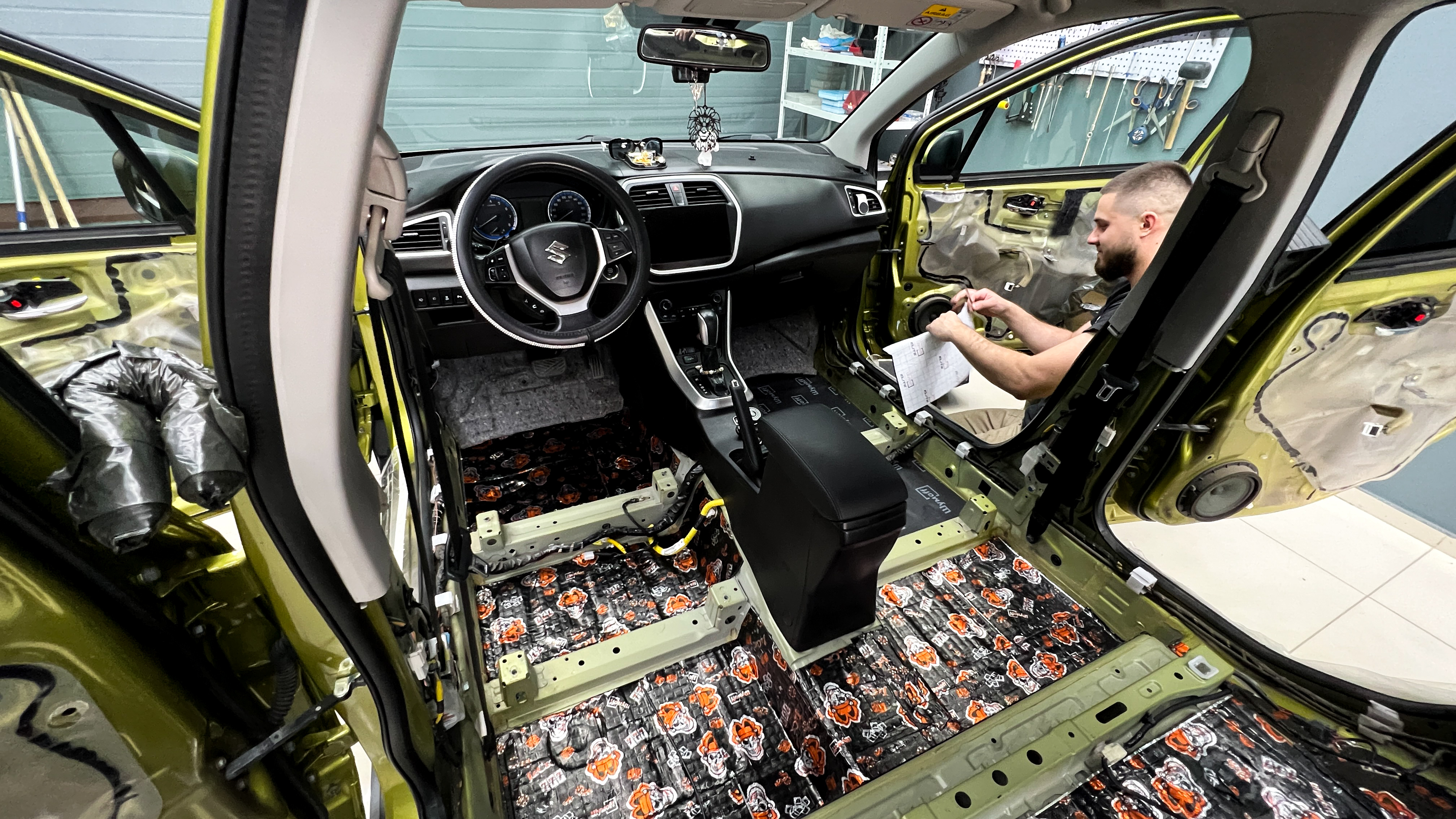 Дно оклеивается многослойным шумо и звукоизолятором Шумофф Prizma 6, крылья, арки и крышка багажника шумопоглотителем Absorber A15.
