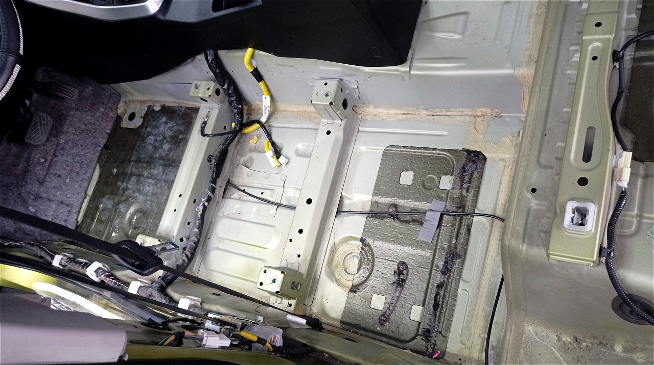 Пол от моторной перегородки и до заднего сиденья оклеивается толстой виброизоляцией Шумофф Super Jack. Под заднее сиденье клеится виброизоляция Шумофф Black Jack.