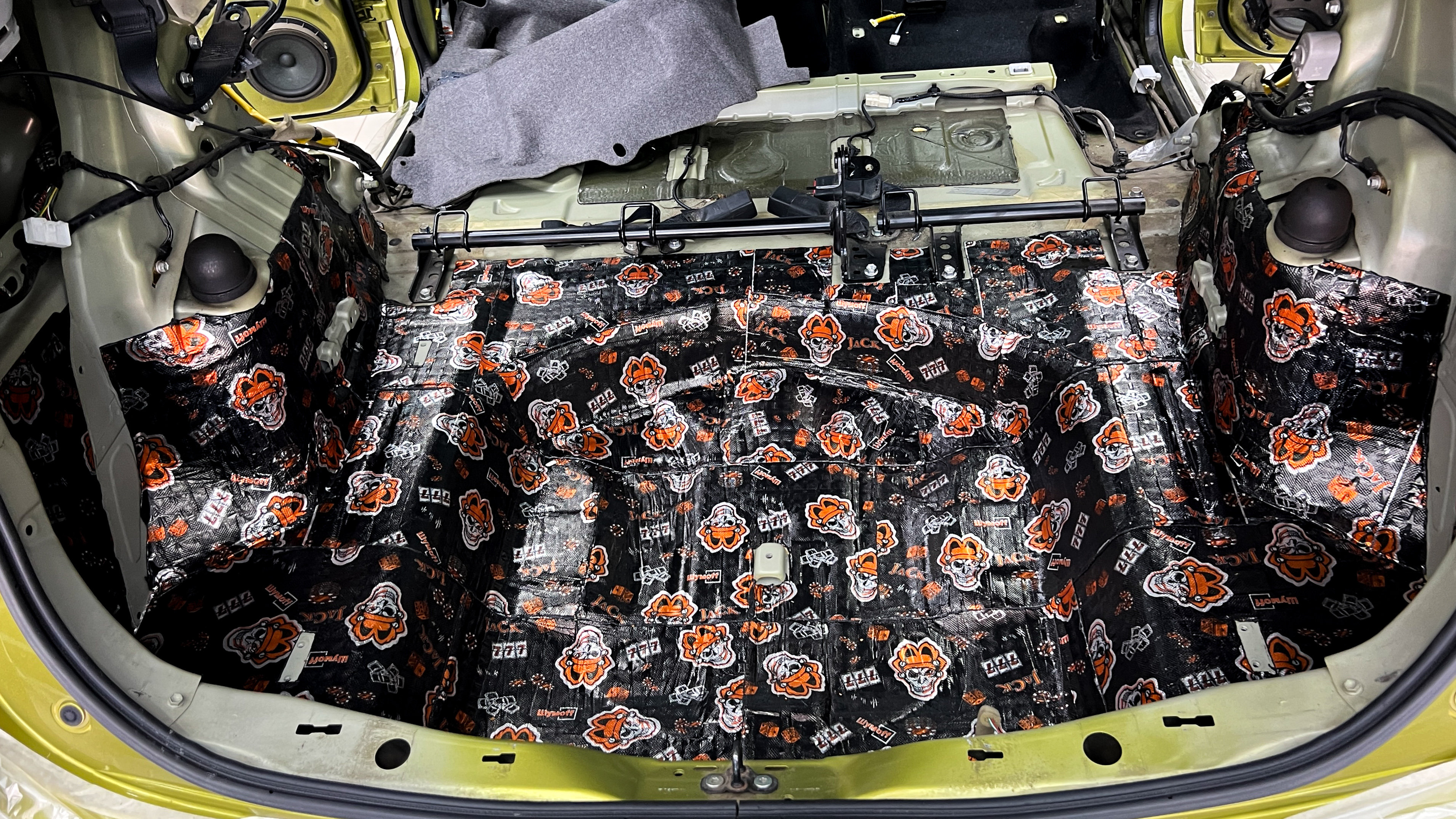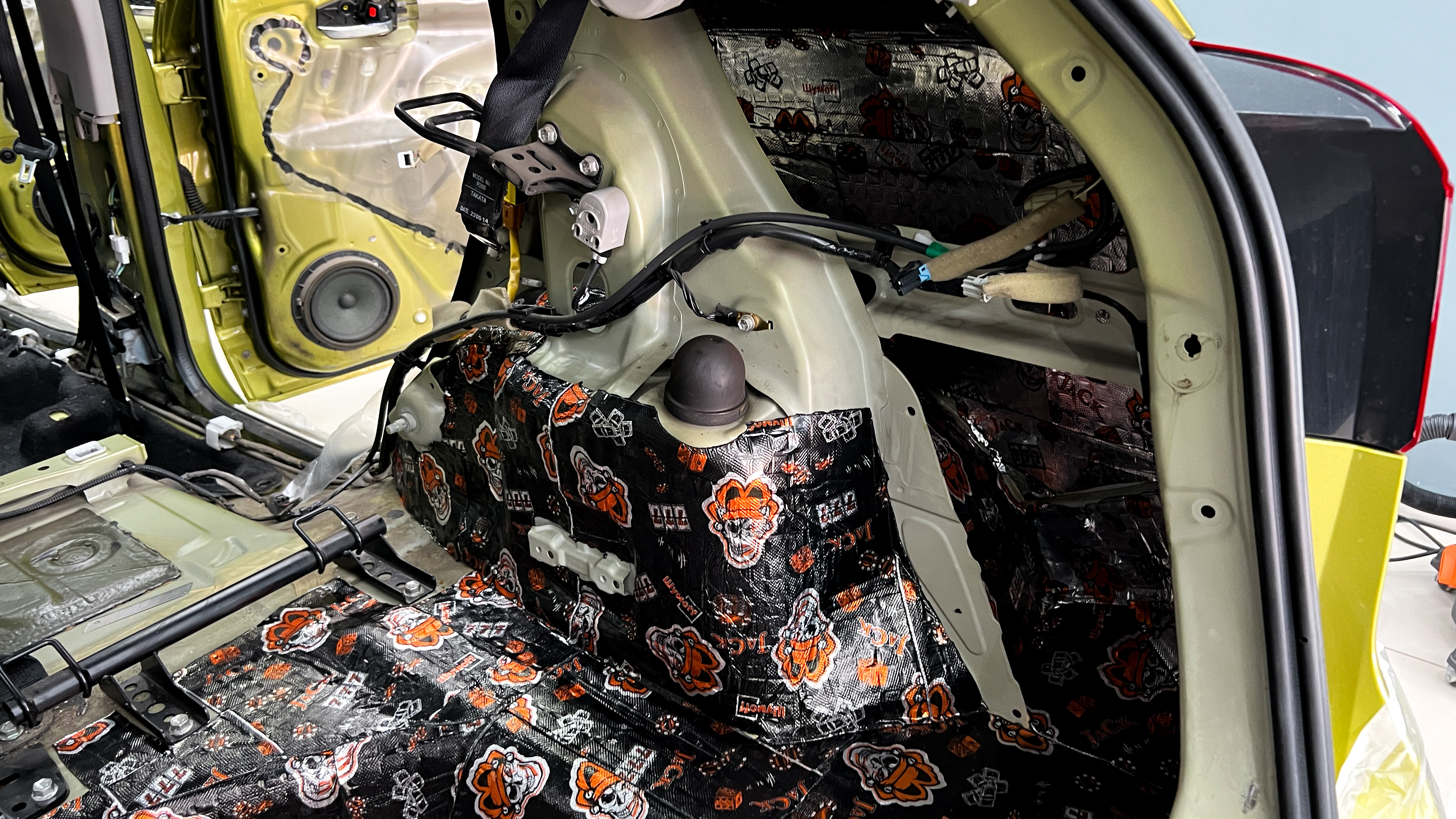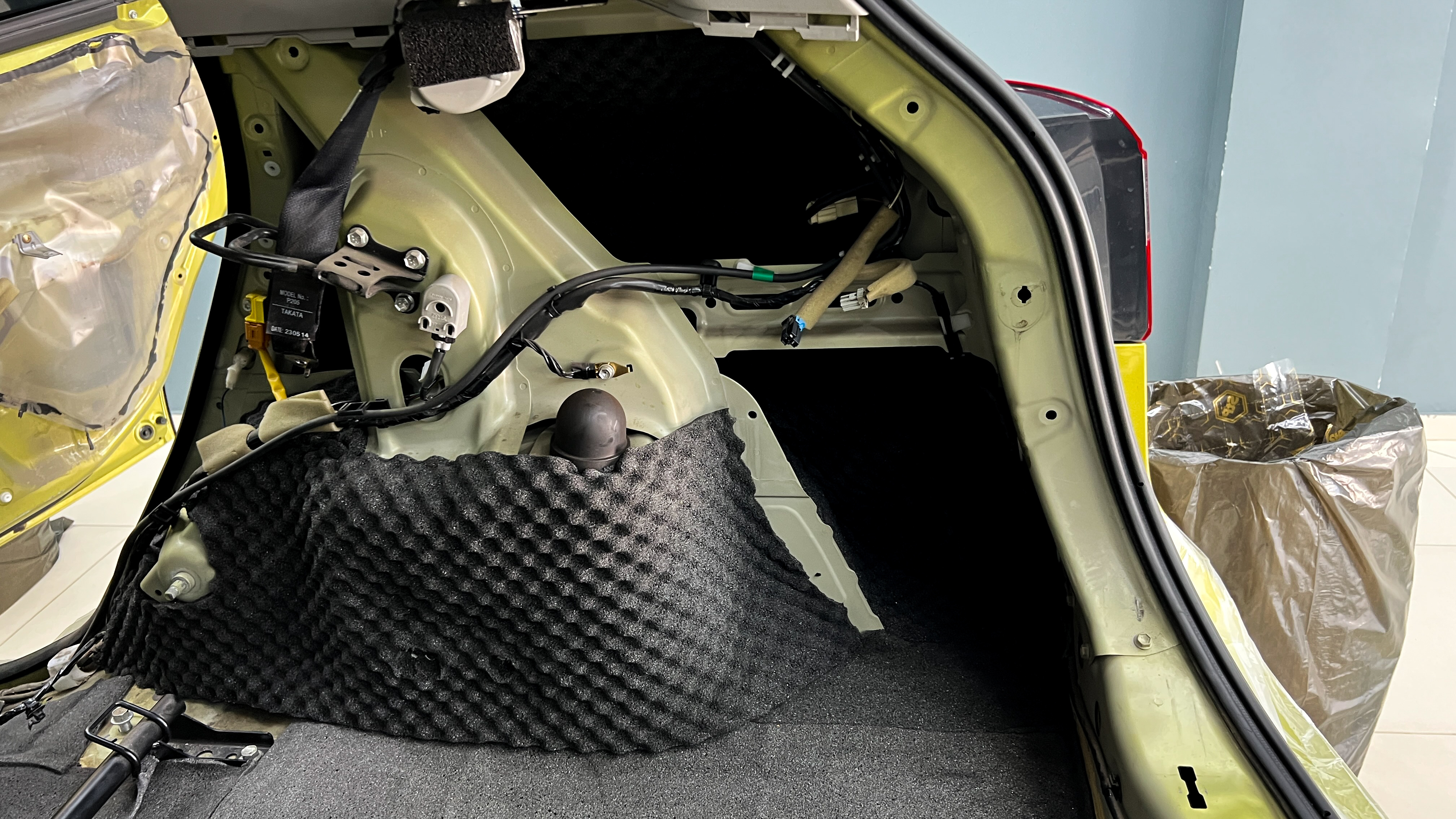 Дно багажника и крылья оклеиваются шумо и теплоизолятором Шумофф П4 4. Арки оклеиваются шумопоглотителем Flex A15.